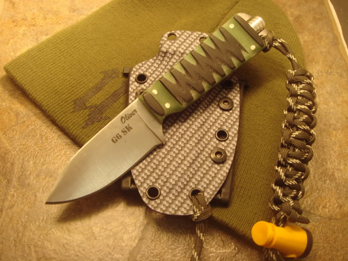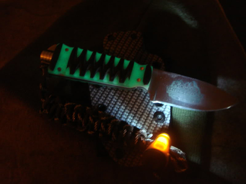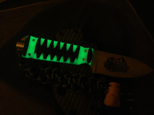 It has Moon Glow in the center of the handle , man its some bright stuff and glows for hours. The lanyard has glow string in it as well. It is also equipped with a whistle and a Black Crater cord light flashlight. Of course all of the knives have a ferrocerium fire steel in the handle as well.