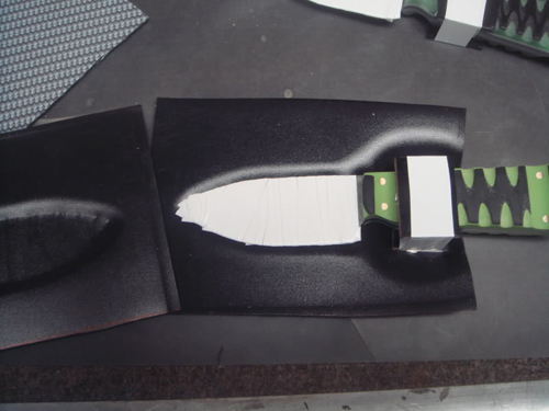 Here is the first one ready for pressing. I tape the chit outa the blade to give it some room inside the sheath , the square on the handle is for the loop to attach to. The Kydex I decided to use has a silver carbon fiber look to it , i think it looks cool. It goes in the oven at 325 deg F hard as hell and comes out soft as dough.