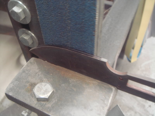 Sanding and shaping is done on the belt grinder , I have a .500" wheel that works great for the finger groove. I use a Hook-it II system( 6" disks with hook and loop straps on them , real fast to change grits ) mounted on the vertical shaft to finish sand handles on. Missed a pic of that.