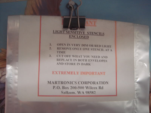 I make my own stencils for marking my name on my blades too. I use this light sensitive material , its like a silkscreen. You put the negative on the glass and then put the stencil material on top. Close the lid , turn on the light , wait 2.5 min and turn the light off. Take it out , peel a clear film off each side and put it in the developer for about a min.....done.
